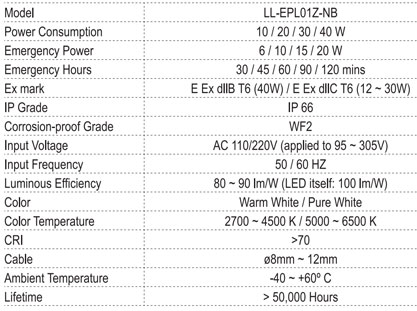 - This series emergency light is composed of EPL01 or EPL05 with emergency device including driving circuit, control circuit, explosion proof box with lithium battery inside.